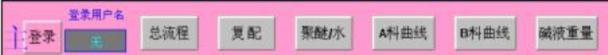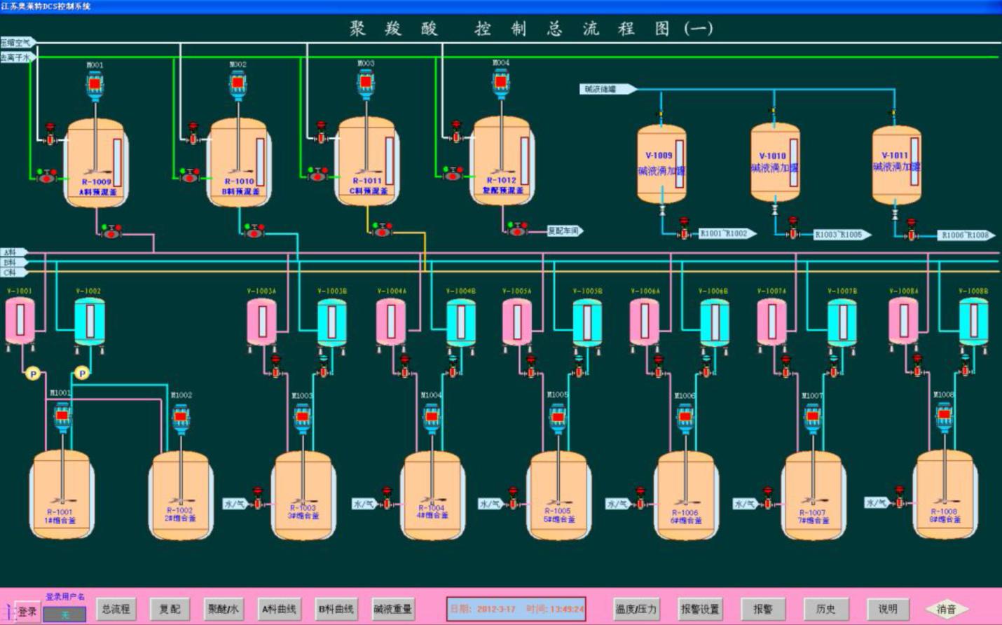 3.主畫(huà)面為縮合車間反應(yīng)界面,可通過(guò)最下方菜單內(nèi)的不同按鈕切換畫(huà)面。可快速切換至反應(yīng)界面,報(bào)警界面,歷史數(shù)據(jù)曲線,實(shí)時(shí)曲線等畫(huà)面。