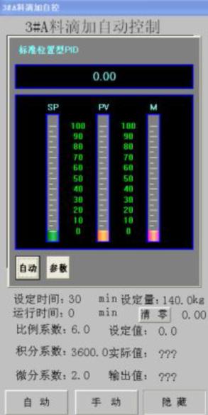 6. 操作員手動(dòng)點(diǎn)選界面內(nèi)反應(yīng)釜,進(jìn)入自動(dòng)控制界面,例:自動(dòng)滴加,在溫度實(shí)時(shí)曲線界面。在時(shí)間、滴加量設(shè)定行,對(duì)反應(yīng)所需達(dá)到量按照不同工藝要求進(jìn)行設(shè)定。點(diǎn)選手動(dòng)自動(dòng)按鈕選至自動(dòng)狀態(tài),則整個(gè)過(guò)程自動(dòng)滴加,依據(jù)現(xiàn)場(chǎng)實(shí)際情況可點(diǎn)選手動(dòng)狀態(tài)適當(dāng)調(diào)節(jié)更精確的實(shí)現(xiàn)現(xiàn)場(chǎng)的調(diào)節(jié)效果。(參數(shù)設(shè)定完成后,務(wù)必隱藏界面,該操作系統(tǒng)最多同時(shí)打開(kāi)20 個(gè)界面)