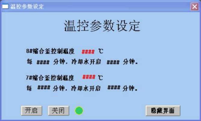 7. 溫度控制:操作員根據(jù)操作工藝設(shè)定好控制溫度,并根據(jù)現(xiàn)場(chǎng)實(shí)際溫度控制情況設(shè)定控制時(shí)間,點(diǎn)選開(kāi)啟,指示燈亮進(jìn)入溫控自動(dòng)流程。